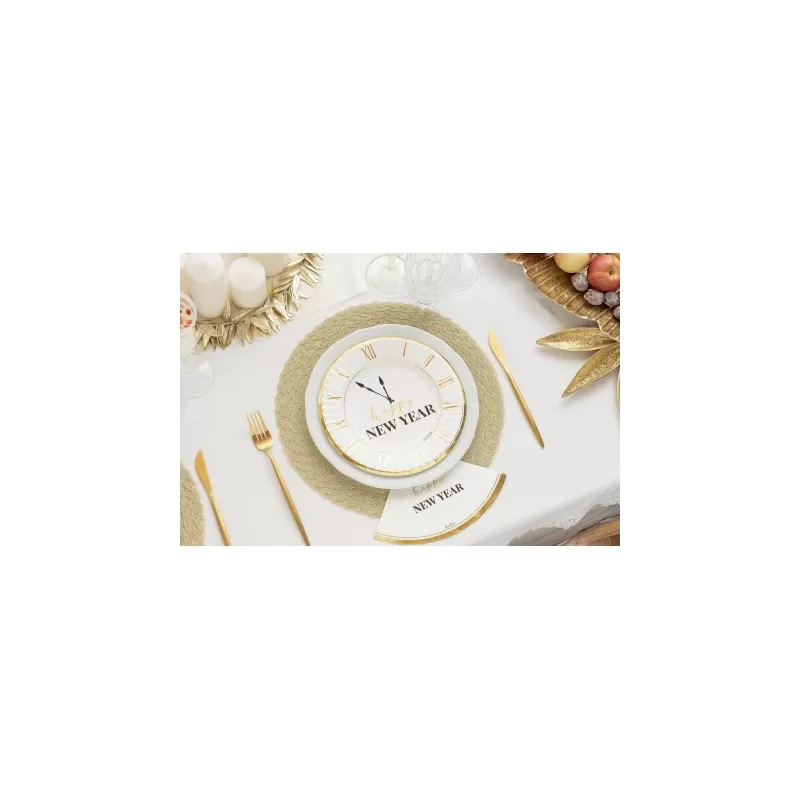 8 piatti cm 23 Happy New Year Clock White. Anno nuovo, vita nuova, l'ultimo giorno dell'anno è sempre un momento speciale, se scegli di stare in casa ed organizzare una cena con le persone più care utilizza il nostro coordinato tavola. Un mix bianco e nero illuminato dal disegno di un orologio metal gold per stupire i tuoi commensali. Givi Italia si impegna verso produzioni ecologicamente sostenibili, abbiamo recepito la direttiva europea SUP, i nostri piatti non contengono plastica e possono essere smaltiti nel contenitore dell’umido.